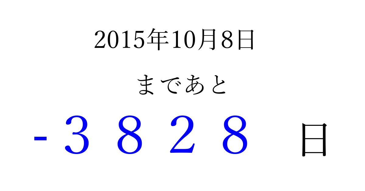 2015年10月8日(木)は もう 0000 日過ぎました 追加すると、トップページからすぐ選べるようになります ※2026/04/01現在の結果です。 最新の状態に更新する ↓シェアして、タイムライン上にカウントダウンを表示しよう!↓ 📤 この結果を共有する Tweet シェア Threads Bluesky 別の日付でカウントダウン 2015年10月のカレンダー このページをブックマークに追加すると、いつでもカウントダウンを確認できます。 (PC: Ctrl+D / Mac: ⌘+D) hitome-notes.comでは以下のページも運営しています。 指定日と期間から日付を計算 | ガチャ確率計算・シミュレーション | プライバシー・ポリシー 運営者:Avocado