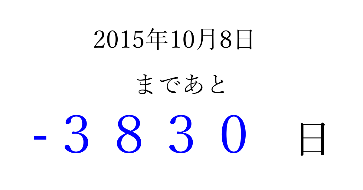 2015年10月8日(木)は もう 0000 日過ぎました 追加すると、トップページからすぐ選べるようになります ※2026/04/03現在の結果です。 最新の状態に更新する ↓シェアして、タイムライン上にカウントダウンを表示しよう!↓ 📤 この結果を共有する Tweet シェア Threads Bluesky 別の日付でカウントダウン 2015年10月のカレンダー このページをブックマークに追加すると、いつでもカウントダウンを確認できます。 (PC: Ctrl+D / Mac: ⌘+D) hitome-notes.comでは以下のページも運営しています。 指定日と期間から日付を計算 | ガチャ確率計算・シミュレーション | プライバシー・ポリシー 運営者:Avocado