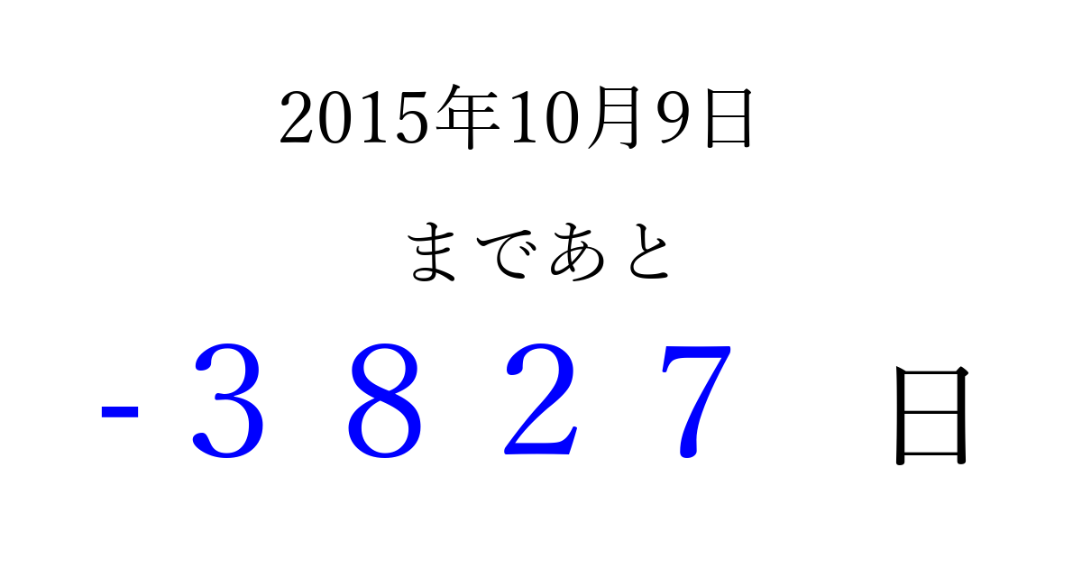 2015年10月9日(金)は もう 0000 日過ぎました 追加すると、トップページからすぐ選べるようになります ※2026/04/01現在の結果です。 最新の状態に更新する ↓シェアして、タイムライン上にカウントダウンを表示しよう!↓ 📤 この結果を共有する Tweet シェア Threads Bluesky 別の日付でカウントダウン 2015年10月のカレンダー このページをブックマークに追加すると、いつでもカウントダウンを確認できます。 (PC: Ctrl+D / Mac: ⌘+D) hitome-notes.comでは以下のページも運営しています。 指定日と期間から日付を計算 | ガチャ確率計算・シミュレーション | プライバシー・ポリシー 運営者:Avocado