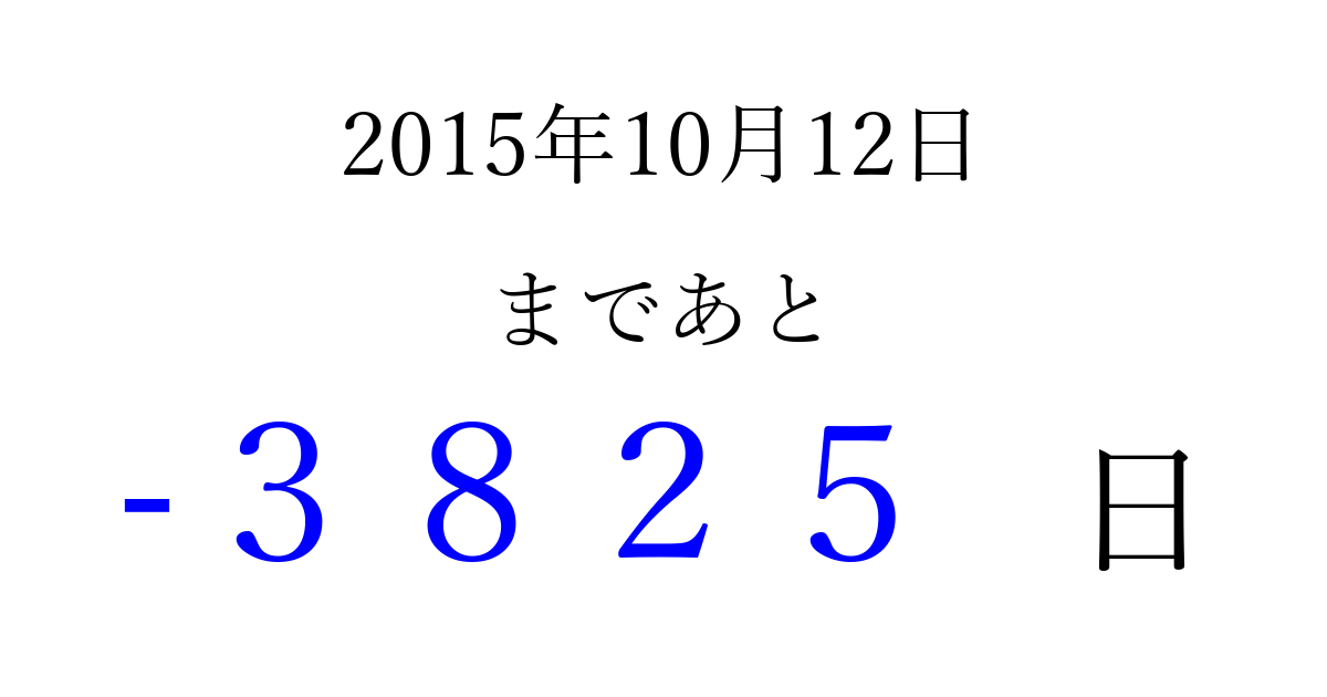 2015年10月12日(月)は もう 0000 日過ぎました 追加すると、トップページからすぐ選べるようになります ※2026/04/02現在の結果です。 最新の状態に更新する ↓シェアして、タイムライン上にカウントダウンを表示しよう!↓ 📤 この結果を共有する Tweet シェア Threads Bluesky 別の日付でカウントダウン 2015年10月のカレンダー このページをブックマークに追加すると、いつでもカウントダウンを確認できます。 (PC: Ctrl+D / Mac: ⌘+D) hitome-notes.comでは以下のページも運営しています。 指定日と期間から日付を計算 | ガチャ確率計算・シミュレーション | プライバシー・ポリシー 運営者:Avocado