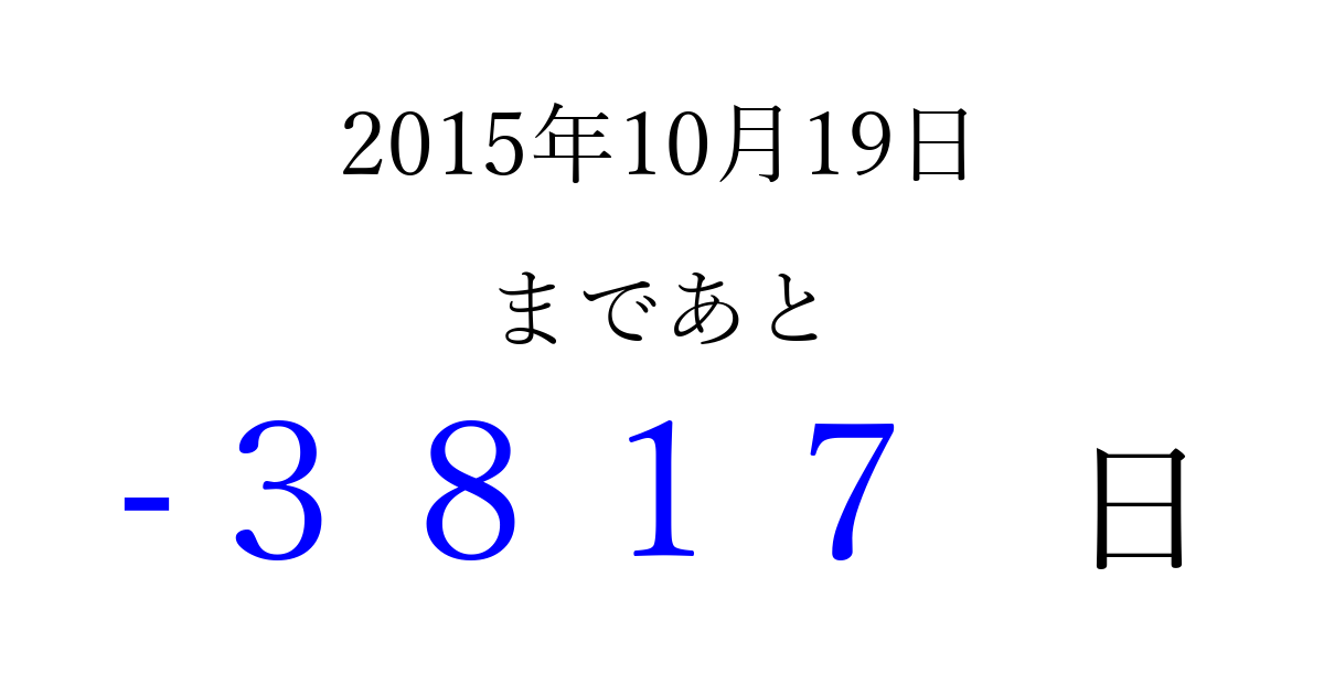 2015年10月19日(月)は もう 0000 日過ぎました 追加すると、トップページからすぐ選べるようになります ※2026/04/01現在の結果です。 最新の状態に更新する ↓シェアして、タイムライン上にカウントダウンを表示しよう!↓ 📤 この結果を共有する Tweet シェア Threads Bluesky 別の日付でカウントダウン 2015年10月のカレンダー このページをブックマークに追加すると、いつでもカウントダウンを確認できます。 (PC: Ctrl+D / Mac: ⌘+D) hitome-notes.comでは以下のページも運営しています。 指定日と期間から日付を計算 | ガチャ確率計算・シミュレーション | プライバシー・ポリシー 運営者:Avocado