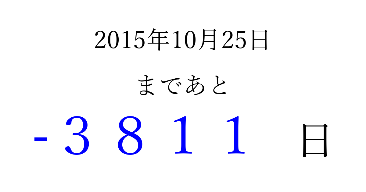 2015年10月25日(日)は もう 0000 日過ぎました 追加すると、トップページからすぐ選べるようになります ※2026/04/01現在の結果です。 最新の状態に更新する ↓シェアして、タイムライン上にカウントダウンを表示しよう!↓ 📤 この結果を共有する Tweet シェア Threads Bluesky 別の日付でカウントダウン 2015年10月のカレンダー このページをブックマークに追加すると、いつでもカウントダウンを確認できます。 (PC: Ctrl+D / Mac: ⌘+D) hitome-notes.comでは以下のページも運営しています。 指定日と期間から日付を計算 | ガチャ確率計算・シミュレーション | プライバシー・ポリシー 運営者:Avocado