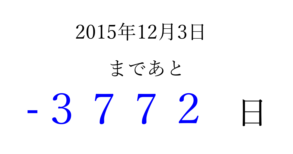 2015年12月3日(木)は もう 0000 日過ぎました 追加すると、トップページからすぐ選べるようになります ※2026/04/01現在の結果です。 最新の状態に更新する ↓シェアして、タイムライン上にカウントダウンを表示しよう!↓ 📤 この結果を共有する Tweet シェア Threads Bluesky 別の日付でカウントダウン 2015年12月のカレンダー このページをブックマークに追加すると、いつでもカウントダウンを確認できます。 (PC: Ctrl+D / Mac: ⌘+D) hitome-notes.comでは以下のページも運営しています。 指定日と期間から日付を計算 | ガチャ確率計算・シミュレーション | プライバシー・ポリシー 運営者:Avocado