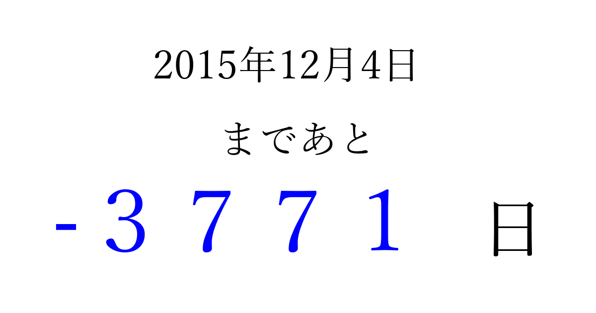 2015年12月4日(金)は もう 0000 日過ぎました 追加すると、トップページからすぐ選べるようになります ※2026/04/01現在の結果です。 最新の状態に更新する ↓シェアして、タイムライン上にカウントダウンを表示しよう!↓ 📤 この結果を共有する Tweet シェア Threads Bluesky 別の日付でカウントダウン 2015年12月のカレンダー このページをブックマークに追加すると、いつでもカウントダウンを確認できます。 (PC: Ctrl+D / Mac: ⌘+D) hitome-notes.comでは以下のページも運営しています。 指定日と期間から日付を計算 | ガチャ確率計算・シミュレーション | プライバシー・ポリシー 運営者:Avocado