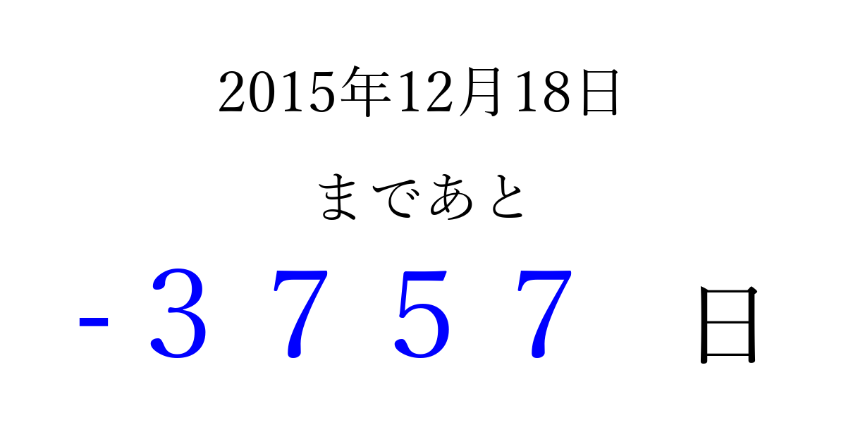 2015年12月18日(金)は もう 0000 日過ぎました 追加すると、トップページからすぐ選べるようになります ※2026/04/01現在の結果です。 最新の状態に更新する ↓シェアして、タイムライン上にカウントダウンを表示しよう!↓ 📤 この結果を共有する Tweet シェア Threads Bluesky 別の日付でカウントダウン 2015年12月のカレンダー このページをブックマークに追加すると、いつでもカウントダウンを確認できます。 (PC: Ctrl+D / Mac: ⌘+D) hitome-notes.comでは以下のページも運営しています。 指定日と期間から日付を計算 | ガチャ確率計算・シミュレーション | プライバシー・ポリシー 運営者:Avocado