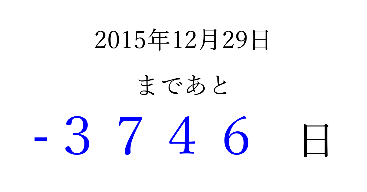 2015年12月29日(火)は もう 0000 日過ぎました 追加すると、トップページからすぐ選べるようになります ※2026/04/01現在の結果です。 最新の状態に更新する ↓シェアして、タイムライン上にカウントダウンを表示しよう!↓ 📤 この結果を共有する Tweet シェア Threads Bluesky 別の日付でカウントダウン 2015年12月のカレンダー このページをブックマークに追加すると、いつでもカウントダウンを確認できます。 (PC: Ctrl+D / Mac: ⌘+D) hitome-notes.comでは以下のページも運営しています。 指定日と期間から日付を計算 | ガチャ確率計算・シミュレーション | プライバシー・ポリシー 運営者:Avocado