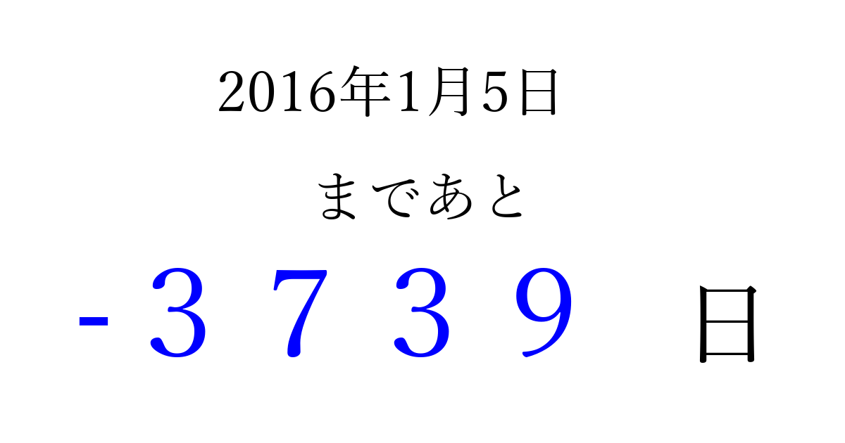 2016年1月5日(火)は もう 0000 日過ぎました 追加すると、トップページからすぐ選べるようになります ※2026/04/01現在の結果です。 最新の状態に更新する ↓シェアして、タイムライン上にカウントダウンを表示しよう!↓ 📤 この結果を共有する Tweet シェア Threads Bluesky 別の日付でカウントダウン 2016年1月のカレンダー このページをブックマークに追加すると、いつでもカウントダウンを確認できます。 (PC: Ctrl+D / Mac: ⌘+D) hitome-notes.comでは以下のページも運営しています。 指定日と期間から日付を計算 | ガチャ確率計算・シミュレーション | プライバシー・ポリシー 運営者:Avocado