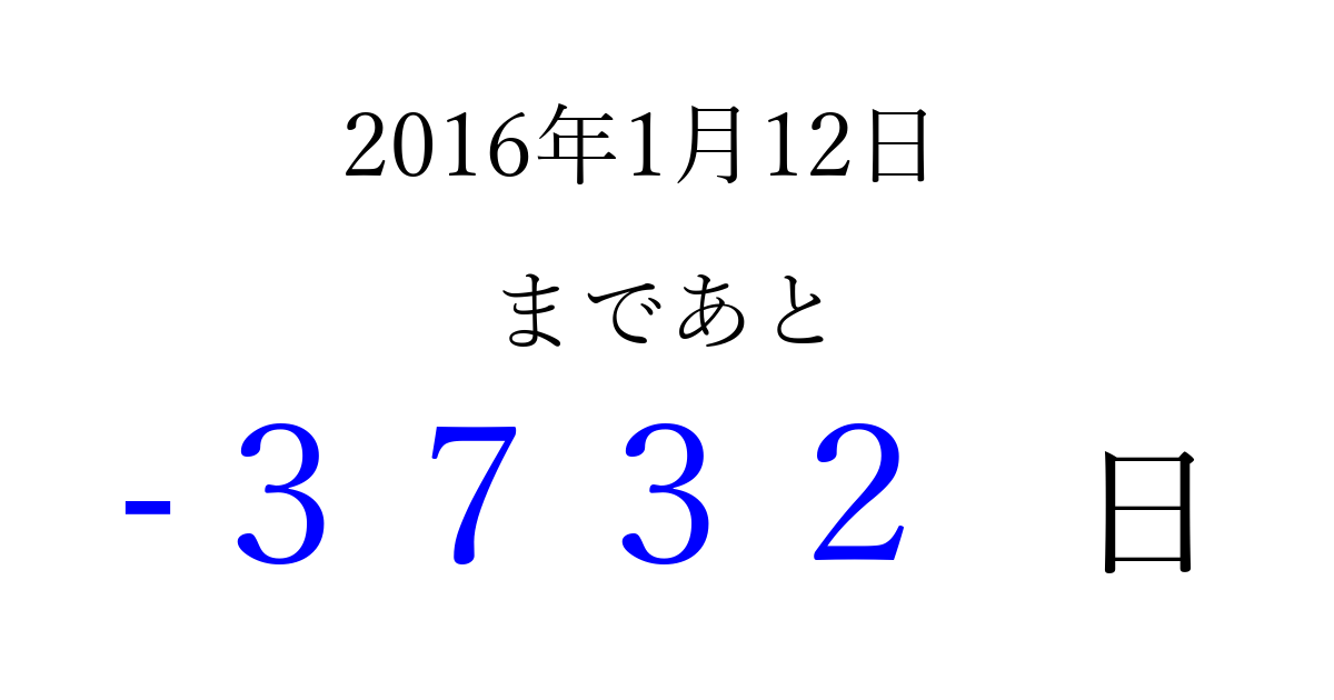 2016年1月12日(火)は もう 0000 日過ぎました 追加すると、トップページからすぐ選べるようになります ※2026/04/01現在の結果です。 最新の状態に更新する ↓シェアして、タイムライン上にカウントダウンを表示しよう!↓ 📤 この結果を共有する Tweet シェア Threads Bluesky 別の日付でカウントダウン 2016年1月のカレンダー このページをブックマークに追加すると、いつでもカウントダウンを確認できます。 (PC: Ctrl+D / Mac: ⌘+D) hitome-notes.comでは以下のページも運営しています。 指定日と期間から日付を計算 | ガチャ確率計算・シミュレーション | プライバシー・ポリシー 運営者:Avocado