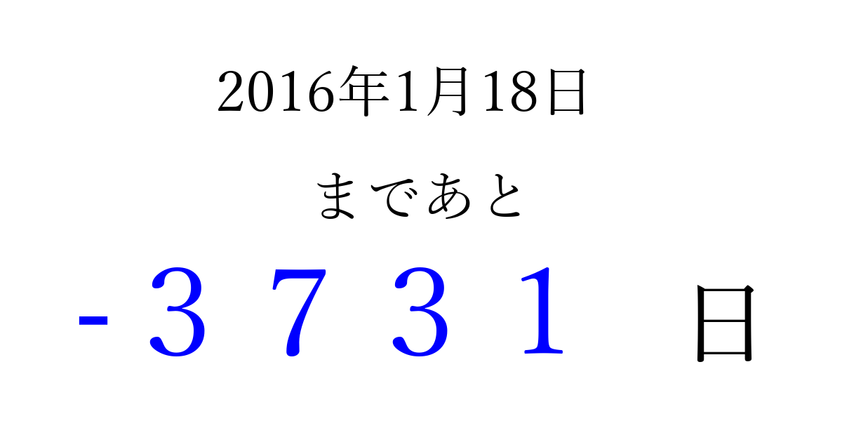 2016年1月18日(月)は もう 0000 日過ぎました 追加すると、トップページからすぐ選べるようになります ※2026/04/06現在の結果です。 最新の状態に更新する ↓シェアして、タイムライン上にカウントダウンを表示しよう!↓ 📤 この結果を共有する Tweet シェア Threads Bluesky 別の日付でカウントダウン 2016年1月のカレンダー このページをブックマークに追加すると、いつでもカウントダウンを確認できます。 (PC: Ctrl+D / Mac: ⌘+D) hitome-notes.comでは以下のページも運営しています。 指定日と期間から日付を計算 | ガチャ確率計算・シミュレーション | プライバシー・ポリシー 運営者:Avocado