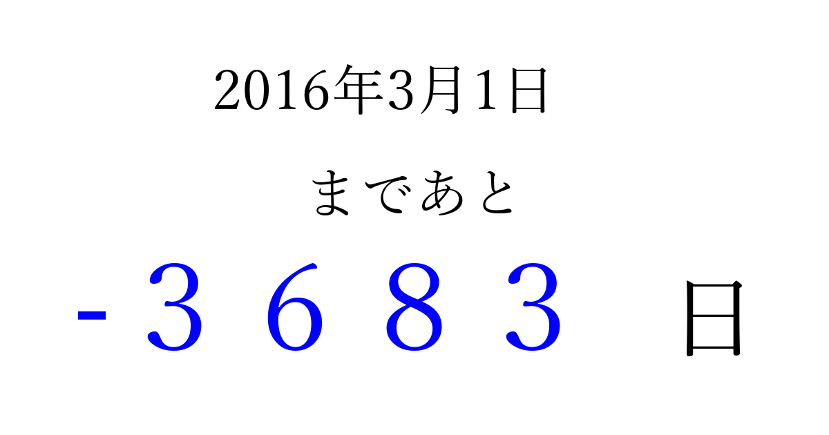 2016年3月1日(火)は もう 0000 日過ぎました 追加すると、トップページからすぐ選べるようになります ※2026/04/01現在の結果です。 最新の状態に更新する ↓シェアして、タイムライン上にカウントダウンを表示しよう!↓ 📤 この結果を共有する Tweet シェア Threads Bluesky 別の日付でカウントダウン 2016年3月のカレンダー このページをブックマークに追加すると、いつでもカウントダウンを確認できます。 (PC: Ctrl+D / Mac: ⌘+D) hitome-notes.comでは以下のページも運営しています。 指定日と期間から日付を計算 | ガチャ確率計算・シミュレーション | プライバシー・ポリシー 運営者:Avocado