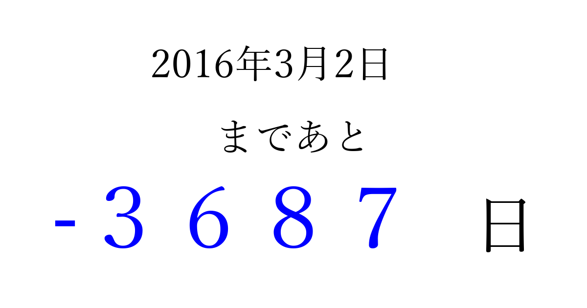 2016年3月2日(水)は もう 0000 日過ぎました 追加すると、トップページからすぐ選べるようになります ※2026/04/06現在の結果です。 最新の状態に更新する ↓シェアして、タイムライン上にカウントダウンを表示しよう!↓ 📤 この結果を共有する Tweet シェア Threads Bluesky 別の日付でカウントダウン 2016年3月のカレンダー このページをブックマークに追加すると、いつでもカウントダウンを確認できます。 (PC: Ctrl+D / Mac: ⌘+D) hitome-notes.comでは以下のページも運営しています。 指定日と期間から日付を計算 | ガチャ確率計算・シミュレーション | プライバシー・ポリシー 運営者:Avocado