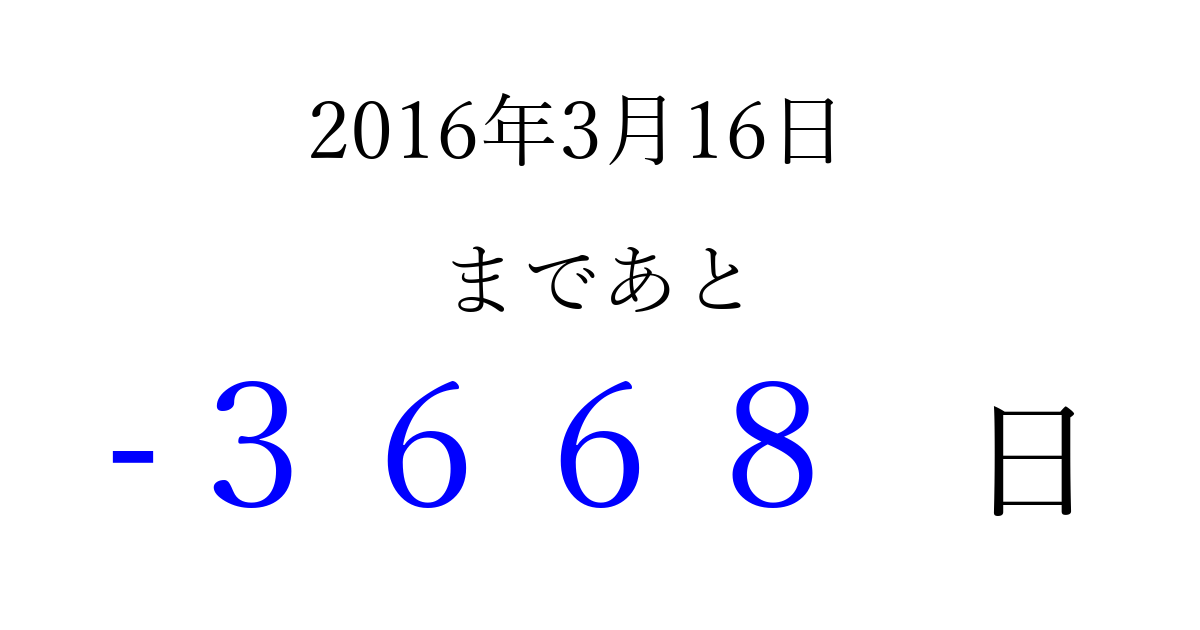 2016年3月16日(水)は もう 0000 日過ぎました 追加すると、トップページからすぐ選べるようになります ※2026/04/01現在の結果です。 最新の状態に更新する ↓シェアして、タイムライン上にカウントダウンを表示しよう!↓ 📤 この結果を共有する Tweet シェア Threads Bluesky 別の日付でカウントダウン 2016年3月のカレンダー このページをブックマークに追加すると、いつでもカウントダウンを確認できます。 (PC: Ctrl+D / Mac: ⌘+D) hitome-notes.comでは以下のページも運営しています。 指定日と期間から日付を計算 | ガチャ確率計算・シミュレーション | プライバシー・ポリシー 運営者:Avocado