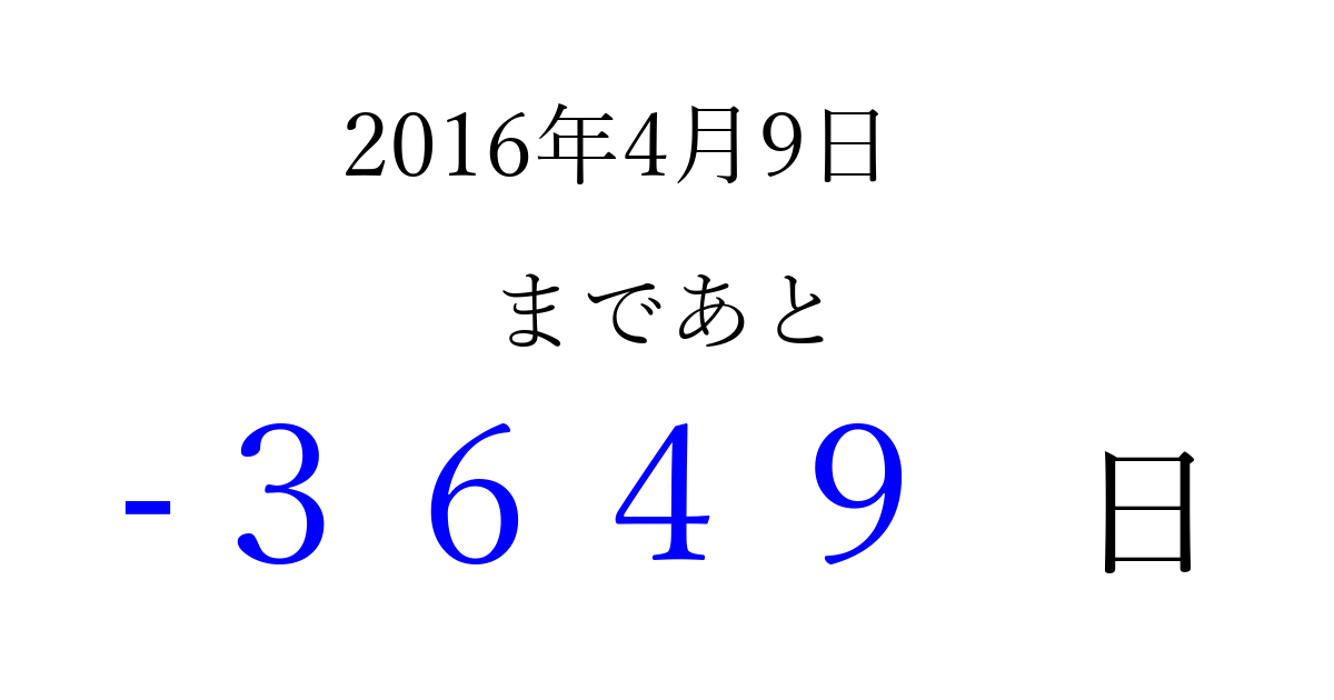 2016年4月9日(土)は もう 0000 日過ぎました 追加すると、トップページからすぐ選べるようになります ※2026/04/06現在の結果です。 最新の状態に更新する ↓シェアして、タイムライン上にカウントダウンを表示しよう!↓ 📤 この結果を共有する Tweet シェア Threads Bluesky 別の日付でカウントダウン 2016年4月のカレンダー このページをブックマークに追加すると、いつでもカウントダウンを確認できます。 (PC: Ctrl+D / Mac: ⌘+D) hitome-notes.comでは以下のページも運営しています。 指定日と期間から日付を計算 | ガチャ確率計算・シミュレーション | プライバシー・ポリシー 運営者:Avocado