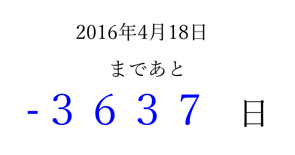 2016年4月18日(月)は もう 0000 日過ぎました 追加すると、トップページからすぐ選べるようになります ※2026/04/03現在の結果です。 最新の状態に更新する ↓シェアして、タイムライン上にカウントダウンを表示しよう!↓ 📤 この結果を共有する Tweet シェア Threads Bluesky 別の日付でカウントダウン 2016年4月のカレンダー このページをブックマークに追加すると、いつでもカウントダウンを確認できます。 (PC: Ctrl+D / Mac: ⌘+D) hitome-notes.comでは以下のページも運営しています。 指定日と期間から日付を計算 | ガチャ確率計算・シミュレーション | プライバシー・ポリシー 運営者:Avocado