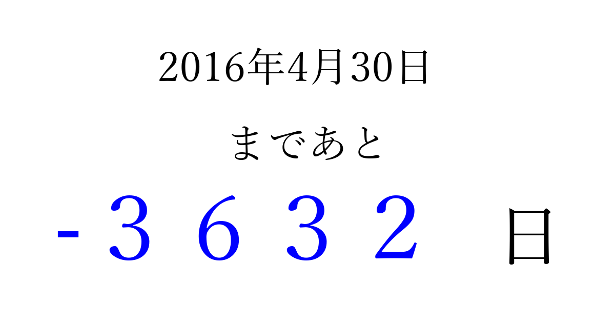 2016年4月30日(土)は もう 0000 日過ぎました 追加すると、トップページからすぐ選べるようになります ※2026/04/10現在の結果です。 最新の状態に更新する ↓シェアして、タイムライン上にカウントダウンを表示しよう!↓ 📤 この結果を共有する Tweet シェア Threads Bluesky 別の日付でカウントダウン 2016年4月のカレンダー このページをブックマークに追加すると、いつでもカウントダウンを確認できます。 (PC: Ctrl+D / Mac: ⌘+D) hitome-notes.comでは以下のページも運営しています。 指定日と期間から日付を計算 | ガチャ確率計算・シミュレーション | プライバシー・ポリシー 運営者:Avocado