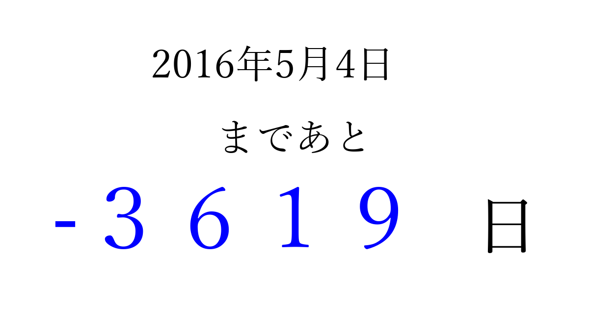 2016年5月4日(水)は もう 0000 日過ぎました 追加すると、トップページからすぐ選べるようになります ※2026/04/01現在の結果です。 最新の状態に更新する ↓シェアして、タイムライン上にカウントダウンを表示しよう!↓ 📤 この結果を共有する Tweet シェア Threads Bluesky 別の日付でカウントダウン 2016年5月のカレンダー このページをブックマークに追加すると、いつでもカウントダウンを確認できます。 (PC: Ctrl+D / Mac: ⌘+D) hitome-notes.comでは以下のページも運営しています。 指定日と期間から日付を計算 | ガチャ確率計算・シミュレーション | プライバシー・ポリシー 運営者:Avocado