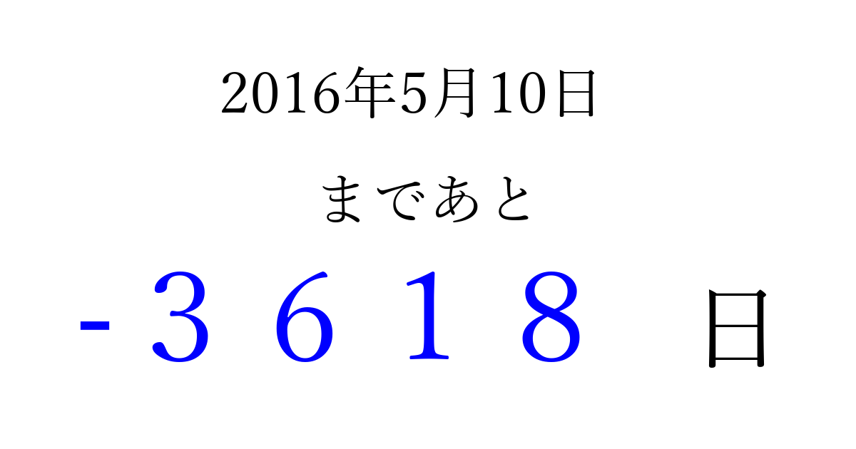 2016年5月10日(火)は もう 0000 日過ぎました 追加すると、トップページからすぐ選べるようになります ※2026/04/06現在の結果です。 最新の状態に更新する ↓シェアして、タイムライン上にカウントダウンを表示しよう!↓ 📤 この結果を共有する Tweet シェア Threads Bluesky 別の日付でカウントダウン 2016年5月のカレンダー このページをブックマークに追加すると、いつでもカウントダウンを確認できます。 (PC: Ctrl+D / Mac: ⌘+D) hitome-notes.comでは以下のページも運営しています。 指定日と期間から日付を計算 | ガチャ確率計算・シミュレーション | プライバシー・ポリシー 運営者:Avocado