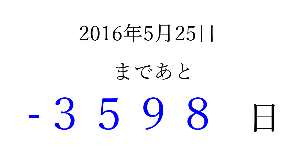 2016年5月25日(水)は もう 0000 日過ぎました 追加すると、トップページからすぐ選べるようになります ※2026/04/01現在の結果です。 最新の状態に更新する ↓シェアして、タイムライン上にカウントダウンを表示しよう!↓ 📤 この結果を共有する Tweet シェア Threads Bluesky 別の日付でカウントダウン 2016年5月のカレンダー このページをブックマークに追加すると、いつでもカウントダウンを確認できます。 (PC: Ctrl+D / Mac: ⌘+D) hitome-notes.comでは以下のページも運営しています。 指定日と期間から日付を計算 | ガチャ確率計算・シミュレーション | プライバシー・ポリシー 運営者:Avocado