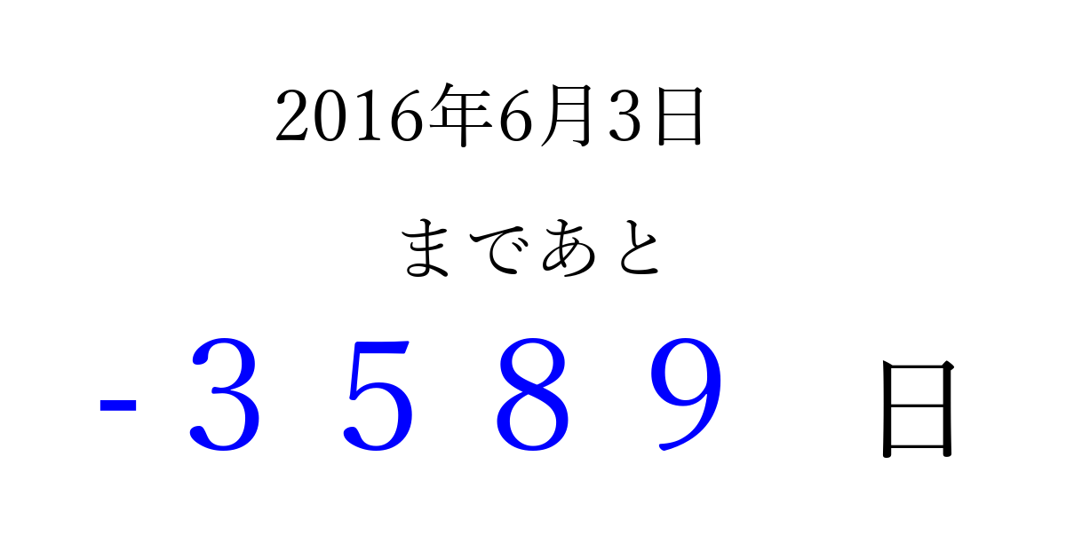 2016年6月3日(金)は もう 0000 日過ぎました 追加すると、トップページからすぐ選べるようになります ※2026/04/01現在の結果です。 最新の状態に更新する ↓シェアして、タイムライン上にカウントダウンを表示しよう!↓ 📤 この結果を共有する Tweet シェア Threads Bluesky 別の日付でカウントダウン 2016年6月のカレンダー このページをブックマークに追加すると、いつでもカウントダウンを確認できます。 (PC: Ctrl+D / Mac: ⌘+D) hitome-notes.comでは以下のページも運営しています。 指定日と期間から日付を計算 | ガチャ確率計算・シミュレーション | プライバシー・ポリシー 運営者:Avocado