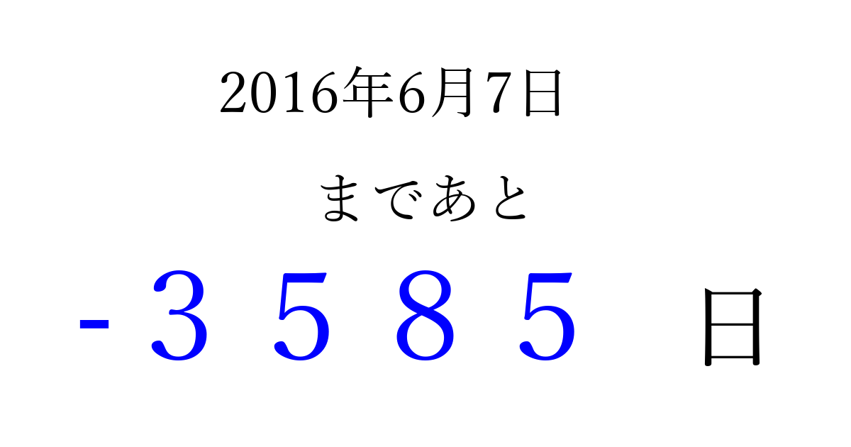 2016年6月7日(火)は もう 0000 日過ぎました 追加すると、トップページからすぐ選べるようになります ※2026/04/01現在の結果です。 最新の状態に更新する ↓シェアして、タイムライン上にカウントダウンを表示しよう!↓ 📤 この結果を共有する Tweet シェア Threads Bluesky 別の日付でカウントダウン 2016年6月のカレンダー このページをブックマークに追加すると、いつでもカウントダウンを確認できます。 (PC: Ctrl+D / Mac: ⌘+D) hitome-notes.comでは以下のページも運営しています。 指定日と期間から日付を計算 | ガチャ確率計算・シミュレーション | プライバシー・ポリシー 運営者:Avocado