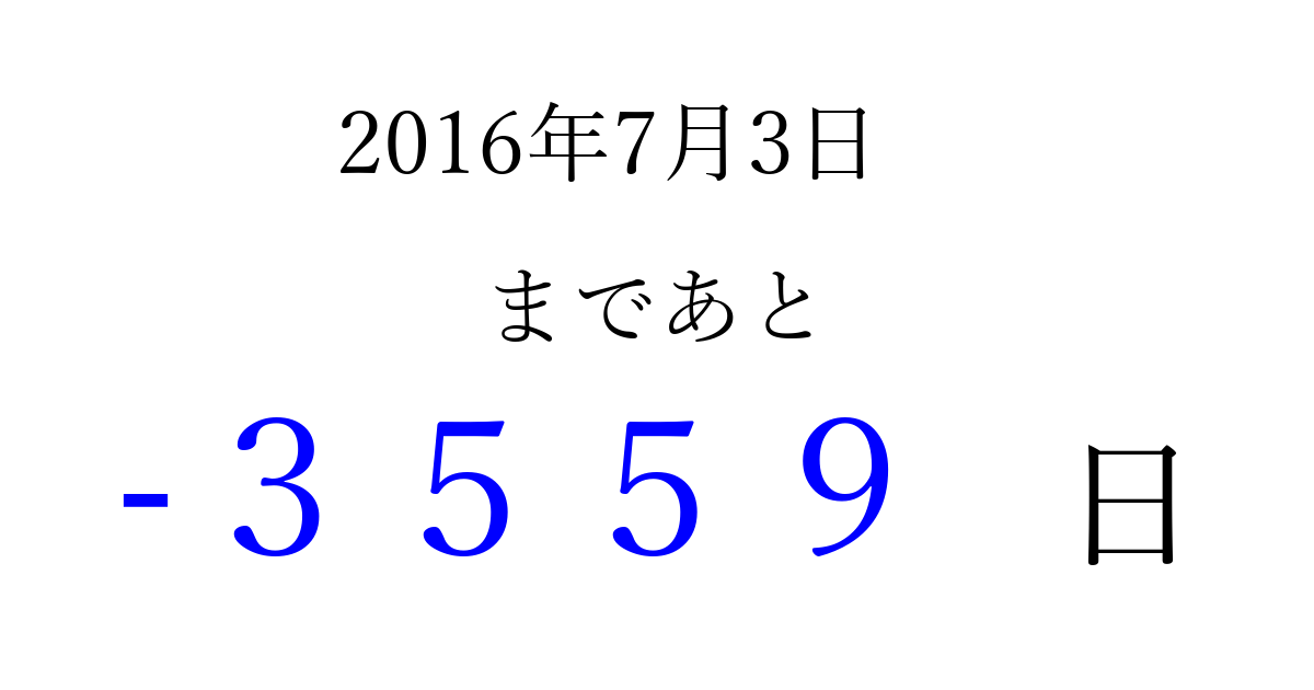 2016年7月3日(日)は もう 0000 日過ぎました 追加すると、トップページからすぐ選べるようになります ※2026/04/01現在の結果です。 最新の状態に更新する ↓シェアして、タイムライン上にカウントダウンを表示しよう!↓ 📤 この結果を共有する Tweet シェア Threads Bluesky 別の日付でカウントダウン 2016年7月のカレンダー このページをブックマークに追加すると、いつでもカウントダウンを確認できます。 (PC: Ctrl+D / Mac: ⌘+D) hitome-notes.comでは以下のページも運営しています。 指定日と期間から日付を計算 | ガチャ確率計算・シミュレーション | プライバシー・ポリシー 運営者:Avocado