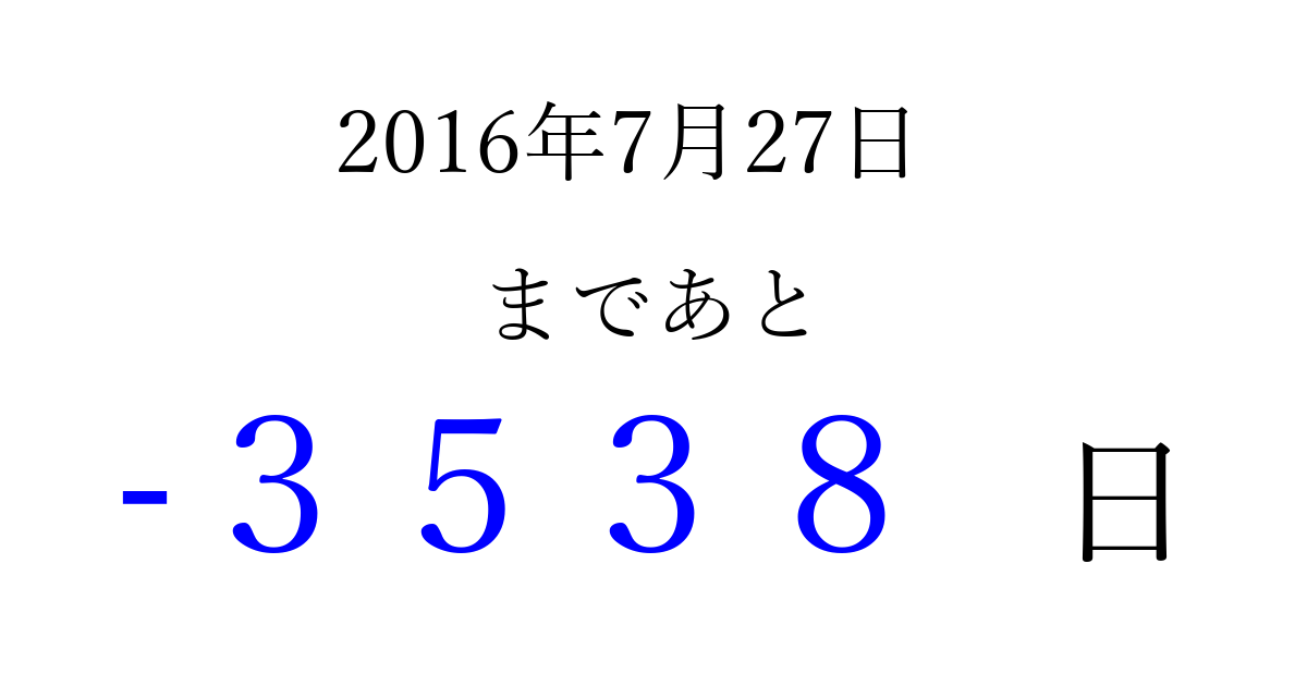 2016年7月27日(水)は もう 0000 日過ぎました 追加すると、トップページからすぐ選べるようになります ※2026/04/04現在の結果です。 最新の状態に更新する ↓シェアして、タイムライン上にカウントダウンを表示しよう!↓ 📤 この結果を共有する Tweet シェア Threads Bluesky 別の日付でカウントダウン 2016年7月のカレンダー このページをブックマークに追加すると、いつでもカウントダウンを確認できます。 (PC: Ctrl+D / Mac: ⌘+D) hitome-notes.comでは以下のページも運営しています。 指定日と期間から日付を計算 | ガチャ確率計算・シミュレーション | プライバシー・ポリシー 運営者:Avocado