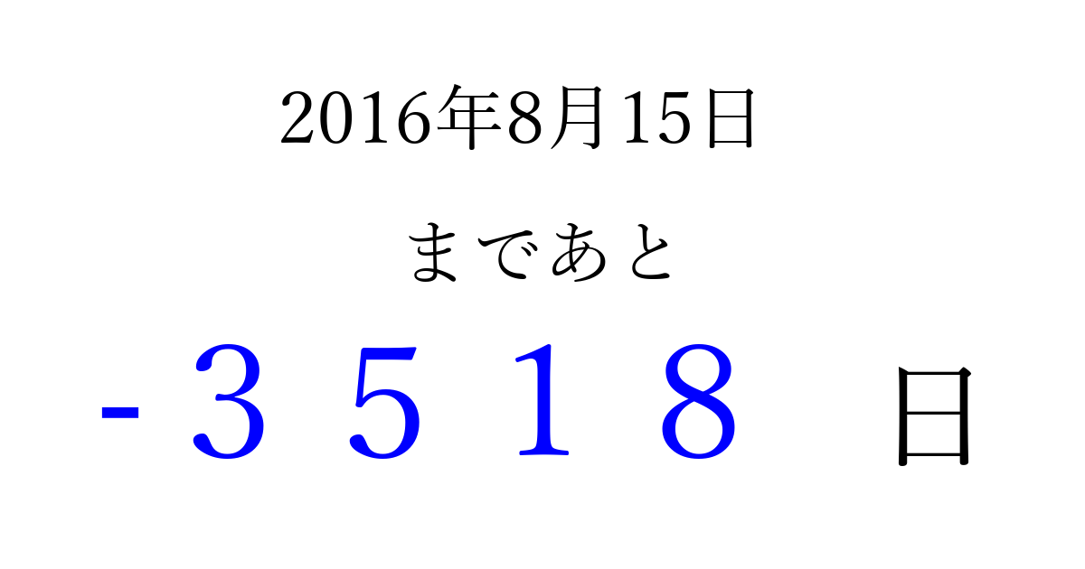 2016年8月15日(月)は もう 0000 日過ぎました 追加すると、トップページからすぐ選べるようになります ※2026/04/03現在の結果です。 最新の状態に更新する ↓シェアして、タイムライン上にカウントダウンを表示しよう!↓ 📤 この結果を共有する Tweet シェア Threads Bluesky 別の日付でカウントダウン 2016年8月のカレンダー このページをブックマークに追加すると、いつでもカウントダウンを確認できます。 (PC: Ctrl+D / Mac: ⌘+D) hitome-notes.comでは以下のページも運営しています。 指定日と期間から日付を計算 | ガチャ確率計算・シミュレーション | プライバシー・ポリシー 運営者:Avocado