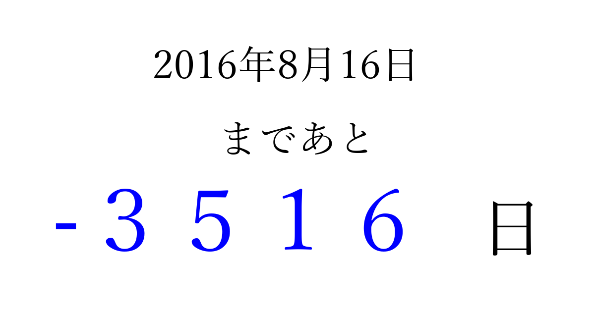 2016年8月16日(火)は もう 0000 日過ぎました 追加すると、トップページからすぐ選べるようになります ※2026/04/02現在の結果です。 最新の状態に更新する ↓シェアして、タイムライン上にカウントダウンを表示しよう!↓ 📤 この結果を共有する Tweet シェア Threads Bluesky 別の日付でカウントダウン 2016年8月のカレンダー このページをブックマークに追加すると、いつでもカウントダウンを確認できます。 (PC: Ctrl+D / Mac: ⌘+D) hitome-notes.comでは以下のページも運営しています。 指定日と期間から日付を計算 | ガチャ確率計算・シミュレーション | プライバシー・ポリシー 運営者:Avocado