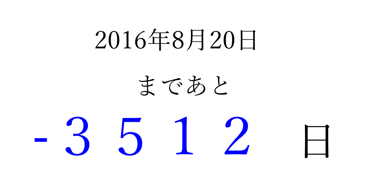 2016年8月20日(土)は もう 0000 日過ぎました 追加すると、トップページからすぐ選べるようになります ※2026/04/02現在の結果です。 最新の状態に更新する ↓シェアして、タイムライン上にカウントダウンを表示しよう!↓ 📤 この結果を共有する Tweet シェア Threads Bluesky 別の日付でカウントダウン 2016年8月のカレンダー このページをブックマークに追加すると、いつでもカウントダウンを確認できます。 (PC: Ctrl+D / Mac: ⌘+D) hitome-notes.comでは以下のページも運営しています。 指定日と期間から日付を計算 | ガチャ確率計算・シミュレーション | プライバシー・ポリシー 運営者:Avocado