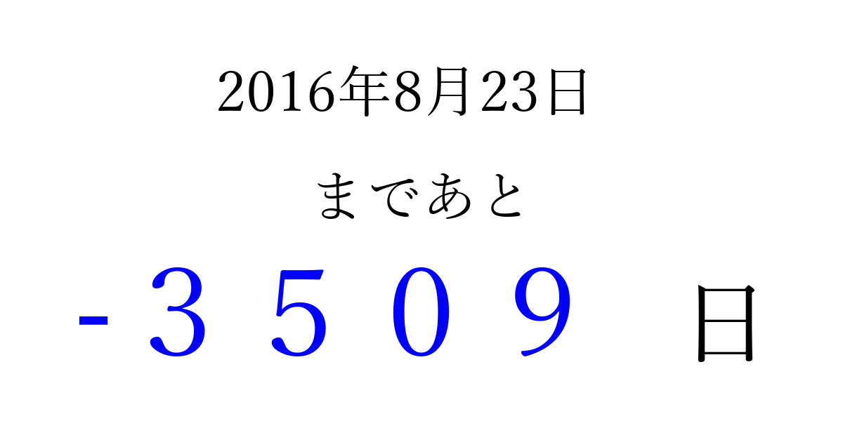 2016年8月23日(火)は もう 0000 日過ぎました 追加すると、トップページからすぐ選べるようになります ※2026/04/02現在の結果です。 最新の状態に更新する ↓シェアして、タイムライン上にカウントダウンを表示しよう!↓ 📤 この結果を共有する Tweet シェア Threads Bluesky 別の日付でカウントダウン 2016年8月のカレンダー このページをブックマークに追加すると、いつでもカウントダウンを確認できます。 (PC: Ctrl+D / Mac: ⌘+D) hitome-notes.comでは以下のページも運営しています。 指定日と期間から日付を計算 | ガチャ確率計算・シミュレーション | プライバシー・ポリシー 運営者:Avocado