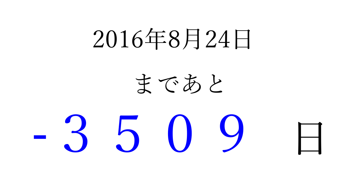 2016年8月24日(水)は もう 0000 日過ぎました 追加すると、トップページからすぐ選べるようになります ※2026/04/03現在の結果です。 最新の状態に更新する ↓シェアして、タイムライン上にカウントダウンを表示しよう!↓ 📤 この結果を共有する Tweet シェア Threads Bluesky 別の日付でカウントダウン 2016年8月のカレンダー このページをブックマークに追加すると、いつでもカウントダウンを確認できます。 (PC: Ctrl+D / Mac: ⌘+D) hitome-notes.comでは以下のページも運営しています。 指定日と期間から日付を計算 | ガチャ確率計算・シミュレーション | プライバシー・ポリシー 運営者:Avocado
