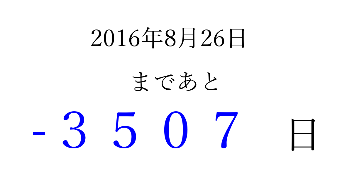 2016年8月26日(金)は もう 0000 日過ぎました 追加すると、トップページからすぐ選べるようになります ※2026/04/03現在の結果です。 最新の状態に更新する ↓シェアして、タイムライン上にカウントダウンを表示しよう!↓ 📤 この結果を共有する Tweet シェア Threads Bluesky 別の日付でカウントダウン 2016年8月のカレンダー このページをブックマークに追加すると、いつでもカウントダウンを確認できます。 (PC: Ctrl+D / Mac: ⌘+D) hitome-notes.comでは以下のページも運営しています。 指定日と期間から日付を計算 | ガチャ確率計算・シミュレーション | プライバシー・ポリシー 運営者:Avocado