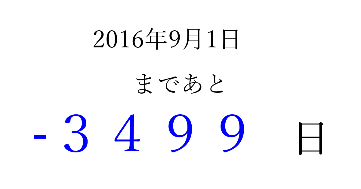 2016年9月1日(木)は もう 0000 日過ぎました 追加すると、トップページからすぐ選べるようになります ※2026/04/01現在の結果です。 最新の状態に更新する ↓シェアして、タイムライン上にカウントダウンを表示しよう!↓ 📤 この結果を共有する Tweet シェア Threads Bluesky 別の日付でカウントダウン 2016年9月のカレンダー このページをブックマークに追加すると、いつでもカウントダウンを確認できます。 (PC: Ctrl+D / Mac: ⌘+D) hitome-notes.comでは以下のページも運営しています。 指定日と期間から日付を計算 | ガチャ確率計算・シミュレーション | プライバシー・ポリシー 運営者:Avocado