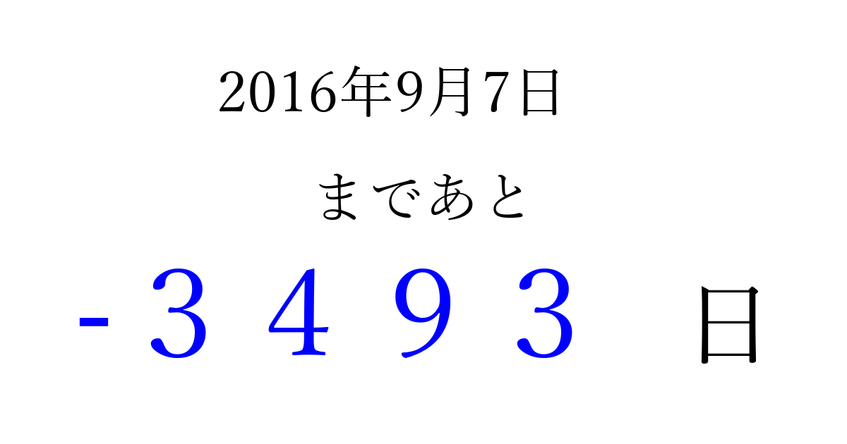 2016年9月7日(水)は もう 0000 日過ぎました 追加すると、トップページからすぐ選べるようになります ※2026/04/01現在の結果です。 最新の状態に更新する ↓シェアして、タイムライン上にカウントダウンを表示しよう!↓ 📤 この結果を共有する Tweet シェア Threads Bluesky 別の日付でカウントダウン 2016年9月のカレンダー このページをブックマークに追加すると、いつでもカウントダウンを確認できます。 (PC: Ctrl+D / Mac: ⌘+D) hitome-notes.comでは以下のページも運営しています。 指定日と期間から日付を計算 | ガチャ確率計算・シミュレーション | プライバシー・ポリシー 運営者:Avocado