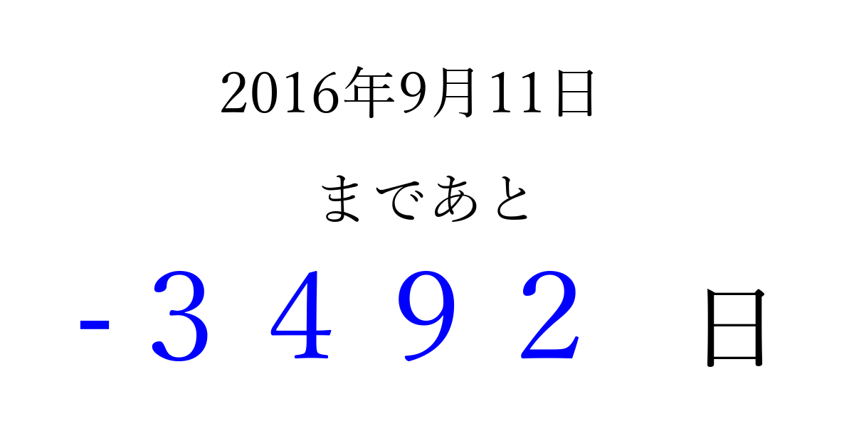 2016年9月11日(日)は もう 0000 日過ぎました 追加すると、トップページからすぐ選べるようになります ※2026/04/04現在の結果です。 最新の状態に更新する ↓シェアして、タイムライン上にカウントダウンを表示しよう!↓ 📤 この結果を共有する Tweet シェア Threads Bluesky 別の日付でカウントダウン 2016年9月のカレンダー このページをブックマークに追加すると、いつでもカウントダウンを確認できます。 (PC: Ctrl+D / Mac: ⌘+D) hitome-notes.comでは以下のページも運営しています。 指定日と期間から日付を計算 | ガチャ確率計算・シミュレーション | プライバシー・ポリシー 運営者:Avocado