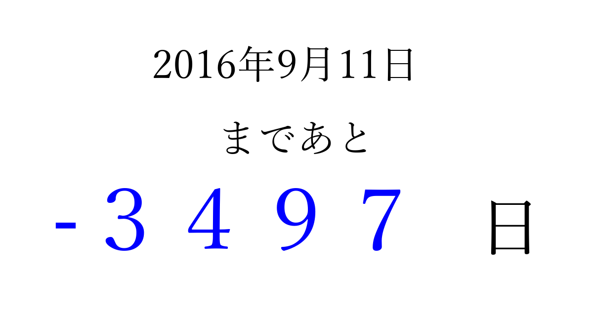 2016年9月11日(日)は もう 0000 日過ぎました 追加すると、トップページからすぐ選べるようになります ※2026/04/09現在の結果です。 最新の状態に更新する ↓シェアして、タイムライン上にカウントダウンを表示しよう!↓ 📤 この結果を共有する Tweet シェア Threads Bluesky 別の日付でカウントダウン 2016年9月のカレンダー このページをブックマークに追加すると、いつでもカウントダウンを確認できます。 (PC: Ctrl+D / Mac: ⌘+D) hitome-notes.comでは以下のページも運営しています。 指定日と期間から日付を計算 | ガチャ確率計算・シミュレーション | プライバシー・ポリシー 運営者:Avocado