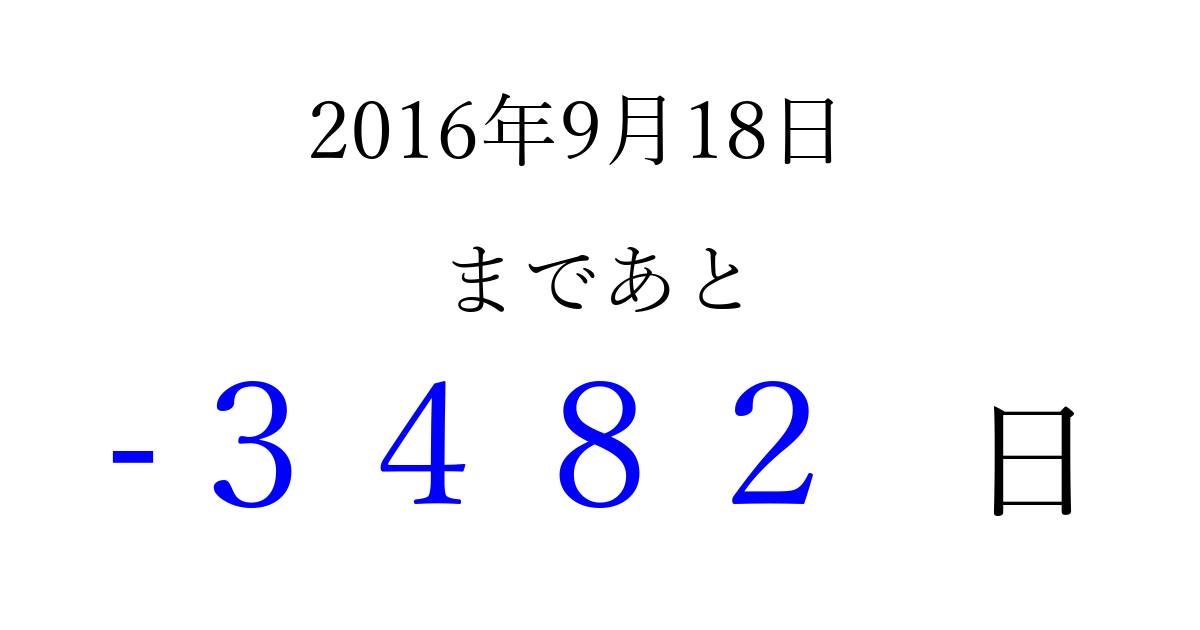 2016年9月18日(日)は もう 0000 日過ぎました 追加すると、トップページからすぐ選べるようになります ※2026/04/01現在の結果です。 最新の状態に更新する ↓シェアして、タイムライン上にカウントダウンを表示しよう!↓ 📤 この結果を共有する Tweet シェア Threads Bluesky 別の日付でカウントダウン 2016年9月のカレンダー このページをブックマークに追加すると、いつでもカウントダウンを確認できます。 (PC: Ctrl+D / Mac: ⌘+D) hitome-notes.comでは以下のページも運営しています。 指定日と期間から日付を計算 | ガチャ確率計算・シミュレーション | プライバシー・ポリシー 運営者:Avocado