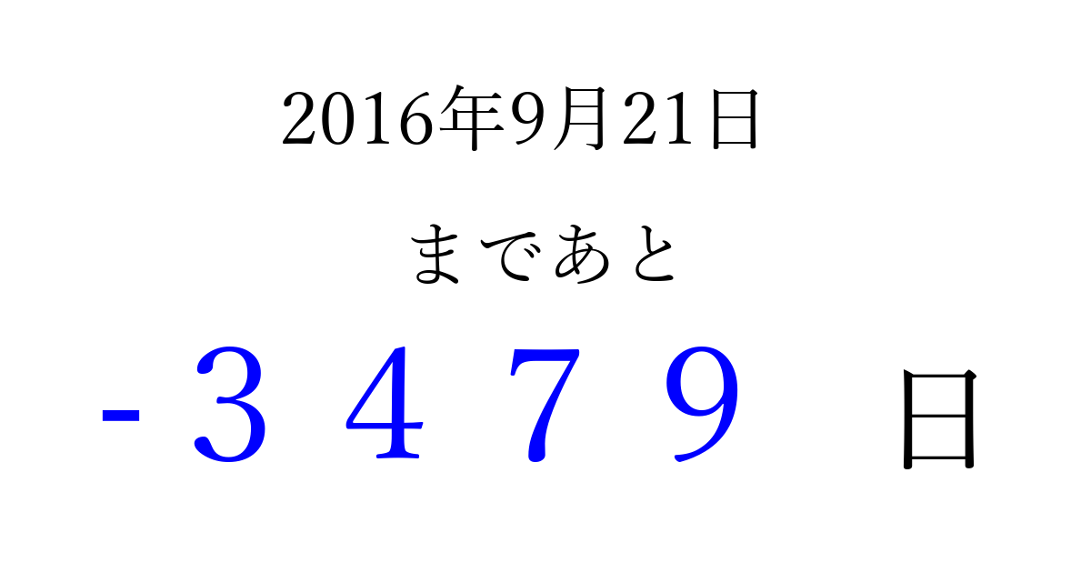 2016年9月21日(水)は もう 0000 日過ぎました 追加すると、トップページからすぐ選べるようになります ※2026/04/01現在の結果です。 最新の状態に更新する ↓シェアして、タイムライン上にカウントダウンを表示しよう!↓ 📤 この結果を共有する Tweet シェア Threads Bluesky 別の日付でカウントダウン 2016年9月のカレンダー このページをブックマークに追加すると、いつでもカウントダウンを確認できます。 (PC: Ctrl+D / Mac: ⌘+D) hitome-notes.comでは以下のページも運営しています。 指定日と期間から日付を計算 | ガチャ確率計算・シミュレーション | プライバシー・ポリシー 運営者:Avocado