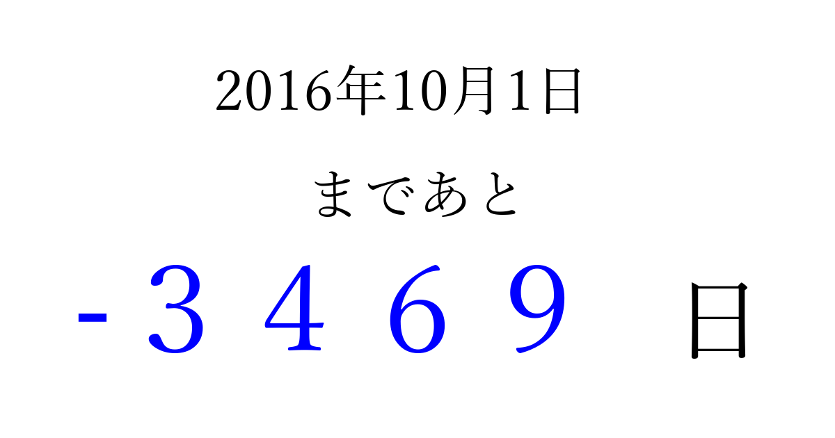 2016年10月1日(土)は もう 0000 日過ぎました 追加すると、トップページからすぐ選べるようになります ※2026/04/01現在の結果です。 最新の状態に更新する ↓シェアして、タイムライン上にカウントダウンを表示しよう!↓ 📤 この結果を共有する Tweet シェア Threads Bluesky 別の日付でカウントダウン 2016年10月のカレンダー このページをブックマークに追加すると、いつでもカウントダウンを確認できます。 (PC: Ctrl+D / Mac: ⌘+D) hitome-notes.comでは以下のページも運営しています。 指定日と期間から日付を計算 | ガチャ確率計算・シミュレーション | プライバシー・ポリシー 運営者:Avocado
