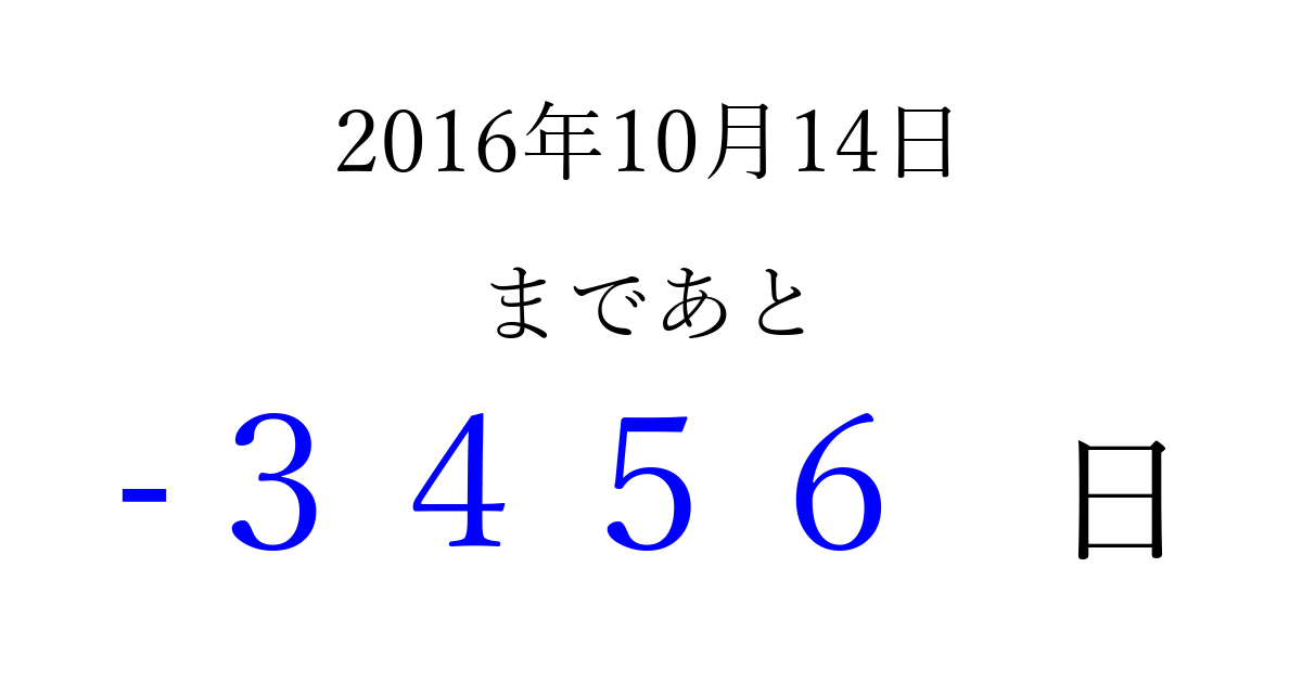 2016年10月14日(金)は もう 0000 日過ぎました 追加すると、トップページからすぐ選べるようになります ※2026/04/01現在の結果です。 最新の状態に更新する ↓シェアして、タイムライン上にカウントダウンを表示しよう!↓ 📤 この結果を共有する Tweet シェア Threads Bluesky 別の日付でカウントダウン 2016年10月のカレンダー このページをブックマークに追加すると、いつでもカウントダウンを確認できます。 (PC: Ctrl+D / Mac: ⌘+D) hitome-notes.comでは以下のページも運営しています。 指定日と期間から日付を計算 | ガチャ確率計算・シミュレーション | プライバシー・ポリシー 運営者:Avocado