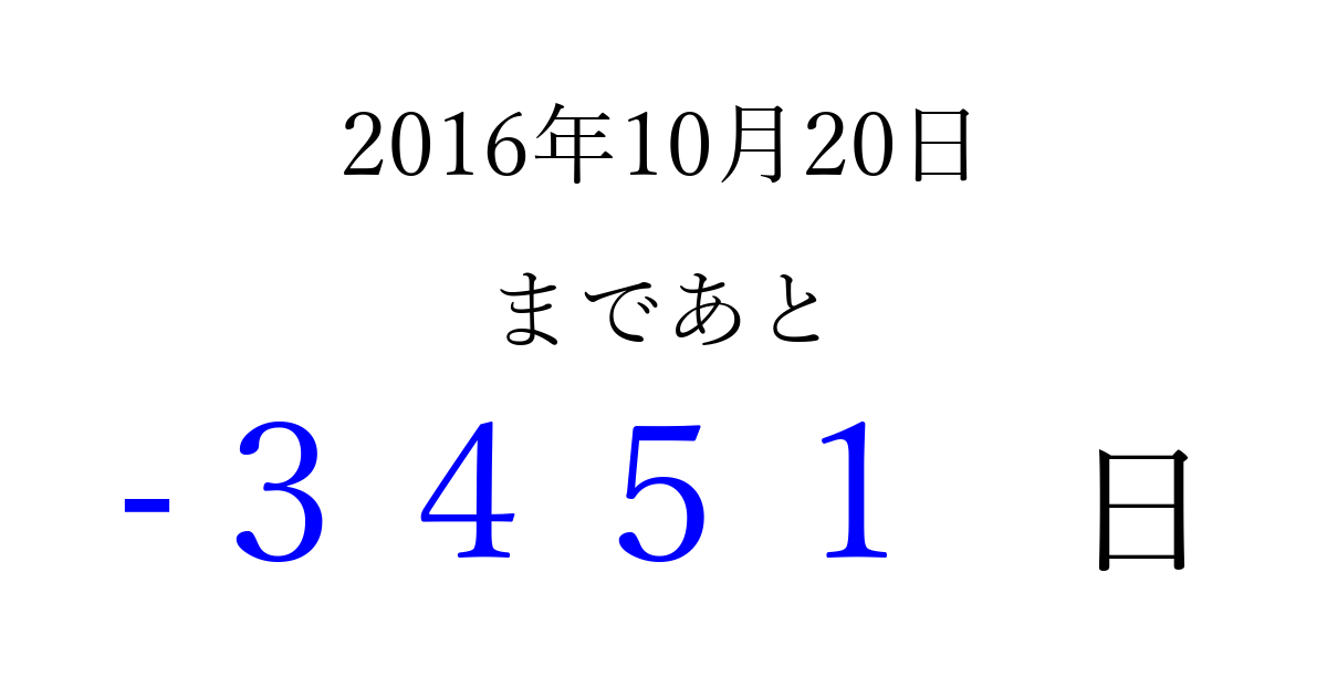 2016年10月20日(木)は もう 0000 日過ぎました 追加すると、トップページからすぐ選べるようになります ※2026/04/02現在の結果です。 最新の状態に更新する ↓シェアして、タイムライン上にカウントダウンを表示しよう!↓ 📤 この結果を共有する Tweet シェア Threads Bluesky 別の日付でカウントダウン 2016年10月のカレンダー このページをブックマークに追加すると、いつでもカウントダウンを確認できます。 (PC: Ctrl+D / Mac: ⌘+D) hitome-notes.comでは以下のページも運営しています。 指定日と期間から日付を計算 | ガチャ確率計算・シミュレーション | プライバシー・ポリシー 運営者:Avocado