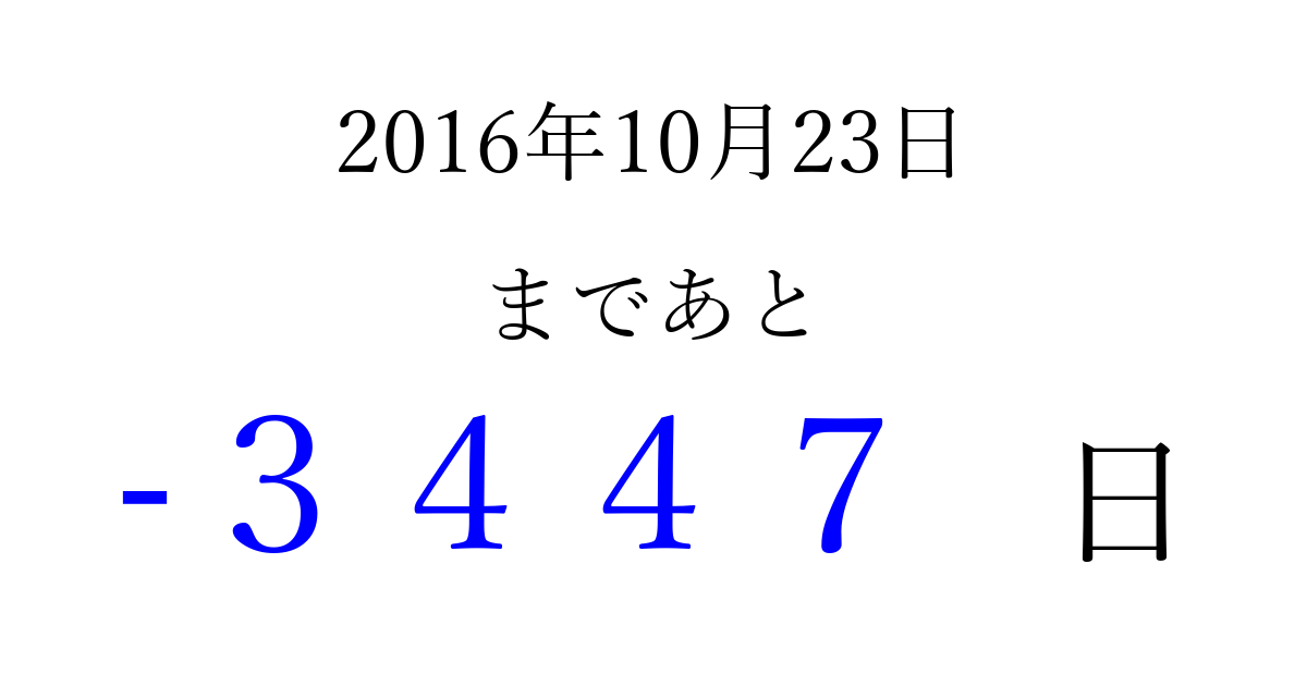 2016年10月23日(日)は もう 0000 日過ぎました 追加すると、トップページからすぐ選べるようになります ※2026/04/01現在の結果です。 最新の状態に更新する ↓シェアして、タイムライン上にカウントダウンを表示しよう!↓ 📤 この結果を共有する Tweet シェア Threads Bluesky 別の日付でカウントダウン 2016年10月のカレンダー このページをブックマークに追加すると、いつでもカウントダウンを確認できます。 (PC: Ctrl+D / Mac: ⌘+D) hitome-notes.comでは以下のページも運営しています。 指定日と期間から日付を計算 | ガチャ確率計算・シミュレーション | プライバシー・ポリシー 運営者:Avocado