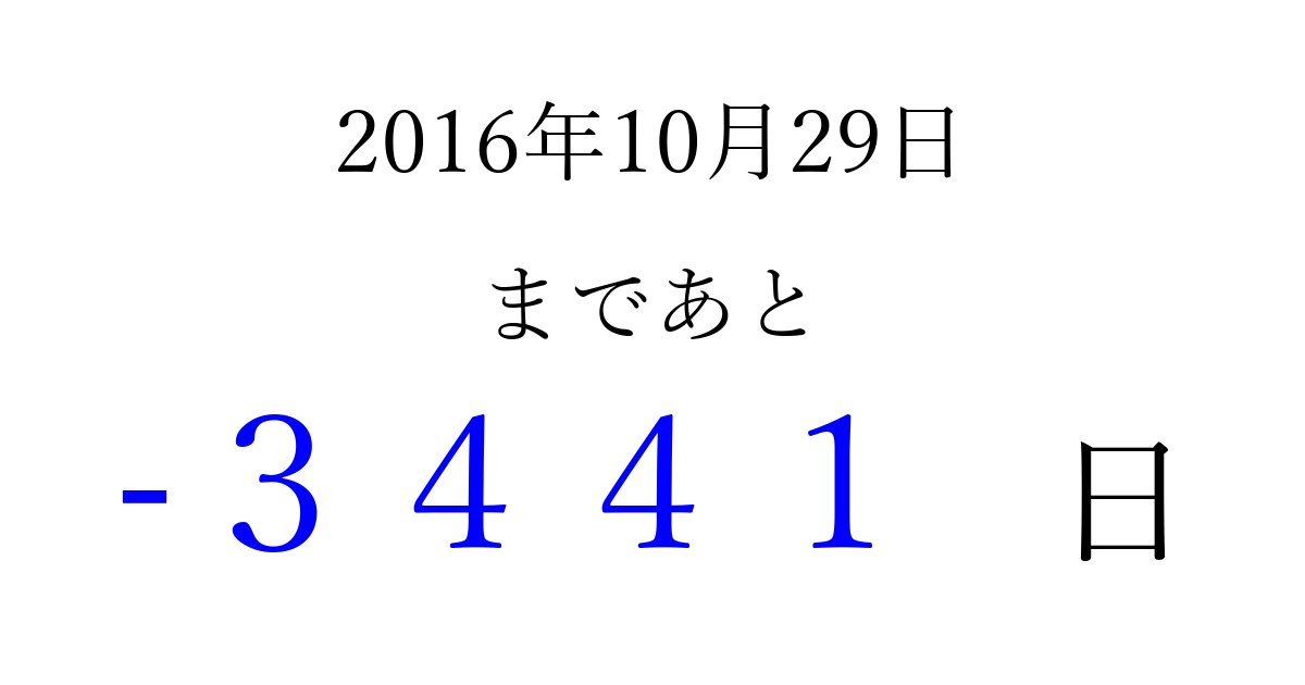 2016年10月29日(土)は もう 0000 日過ぎました 追加すると、トップページからすぐ選べるようになります ※2026/04/01現在の結果です。 最新の状態に更新する ↓シェアして、タイムライン上にカウントダウンを表示しよう!↓ 📤 この結果を共有する Tweet シェア Threads Bluesky 別の日付でカウントダウン 2016年10月のカレンダー このページをブックマークに追加すると、いつでもカウントダウンを確認できます。 (PC: Ctrl+D / Mac: ⌘+D) hitome-notes.comでは以下のページも運営しています。 指定日と期間から日付を計算 | ガチャ確率計算・シミュレーション | プライバシー・ポリシー 運営者:Avocado
