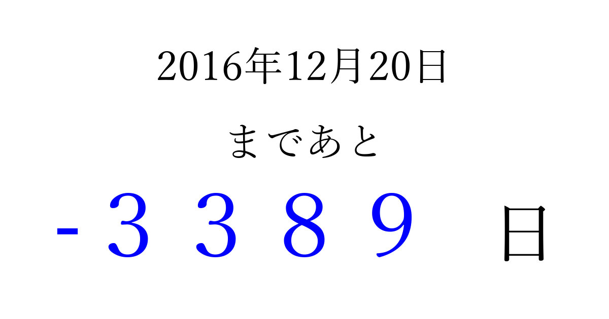 2016年12月20日(火)は もう 0000 日過ぎました 追加すると、トップページからすぐ選べるようになります ※2026/04/01現在の結果です。 最新の状態に更新する ↓シェアして、タイムライン上にカウントダウンを表示しよう!↓ 📤 この結果を共有する Tweet シェア Threads Bluesky 別の日付でカウントダウン 2016年12月のカレンダー このページをブックマークに追加すると、いつでもカウントダウンを確認できます。 (PC: Ctrl+D / Mac: ⌘+D) hitome-notes.comでは以下のページも運営しています。 指定日と期間から日付を計算 | ガチャ確率計算・シミュレーション | プライバシー・ポリシー 運営者:Avocado