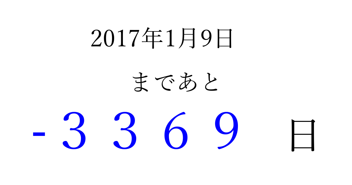 2017年1月9日(月)は もう 0000 日過ぎました 追加すると、トップページからすぐ選べるようになります ※2026/04/01現在の結果です。 最新の状態に更新する ↓シェアして、タイムライン上にカウントダウンを表示しよう!↓ 📤 この結果を共有する Tweet シェア Threads Bluesky 別の日付でカウントダウン 2017年1月のカレンダー このページをブックマークに追加すると、いつでもカウントダウンを確認できます。 (PC: Ctrl+D / Mac: ⌘+D) hitome-notes.comでは以下のページも運営しています。 指定日と期間から日付を計算 | ガチャ確率計算・シミュレーション | プライバシー・ポリシー 運営者:Avocado