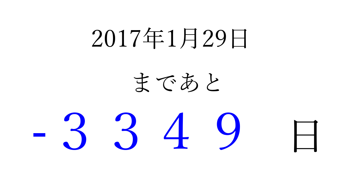 2017年1月29日(日)は もう 0000 日過ぎました 追加すると、トップページからすぐ選べるようになります ※2026/04/01現在の結果です。 最新の状態に更新する ↓シェアして、タイムライン上にカウントダウンを表示しよう!↓ 📤 この結果を共有する Tweet シェア Threads Bluesky 別の日付でカウントダウン 2017年1月のカレンダー このページをブックマークに追加すると、いつでもカウントダウンを確認できます。 (PC: Ctrl+D / Mac: ⌘+D) hitome-notes.comでは以下のページも運営しています。 指定日と期間から日付を計算 | ガチャ確率計算・シミュレーション | プライバシー・ポリシー 運営者:Avocado