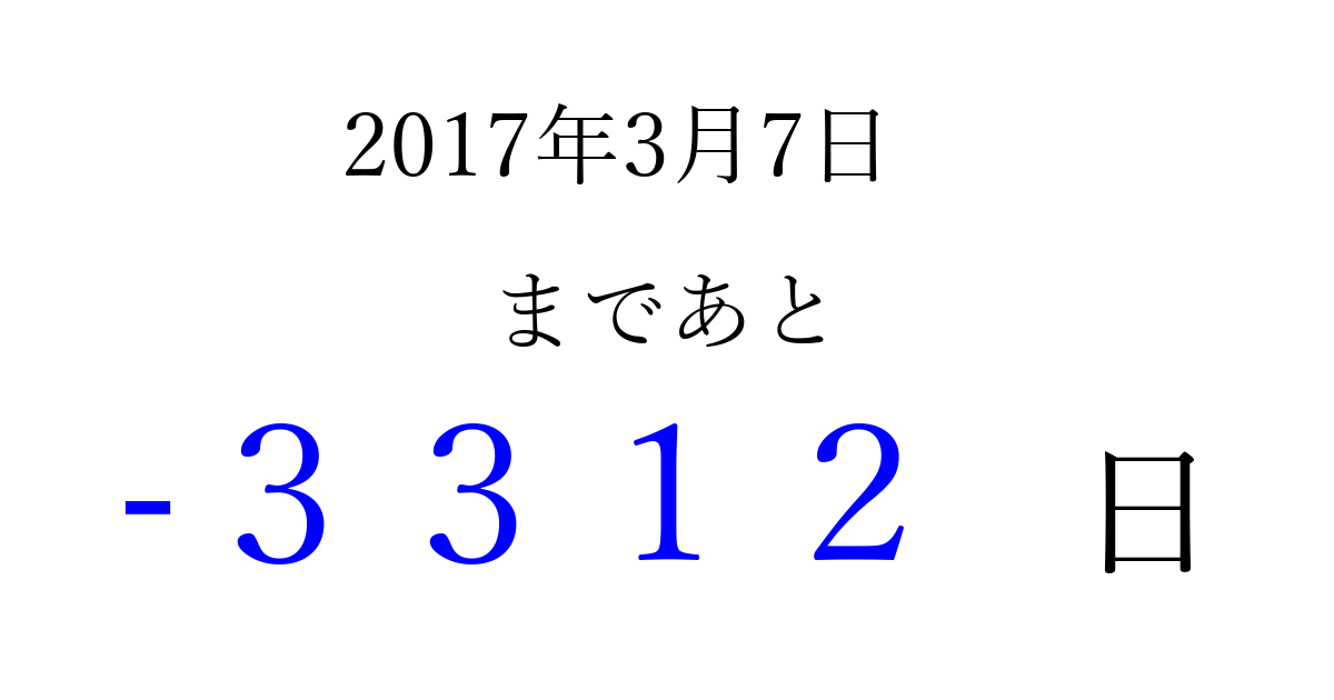 2017年3月7日(火)は もう 0000 日過ぎました 追加すると、トップページからすぐ選べるようになります ※2026/04/01現在の結果です。 最新の状態に更新する ↓シェアして、タイムライン上にカウントダウンを表示しよう!↓ 📤 この結果を共有する Tweet シェア Threads Bluesky 別の日付でカウントダウン 2017年3月のカレンダー このページをブックマークに追加すると、いつでもカウントダウンを確認できます。 (PC: Ctrl+D / Mac: ⌘+D) hitome-notes.comでは以下のページも運営しています。 指定日と期間から日付を計算 | ガチャ確率計算・シミュレーション | プライバシー・ポリシー 運営者:Avocado
