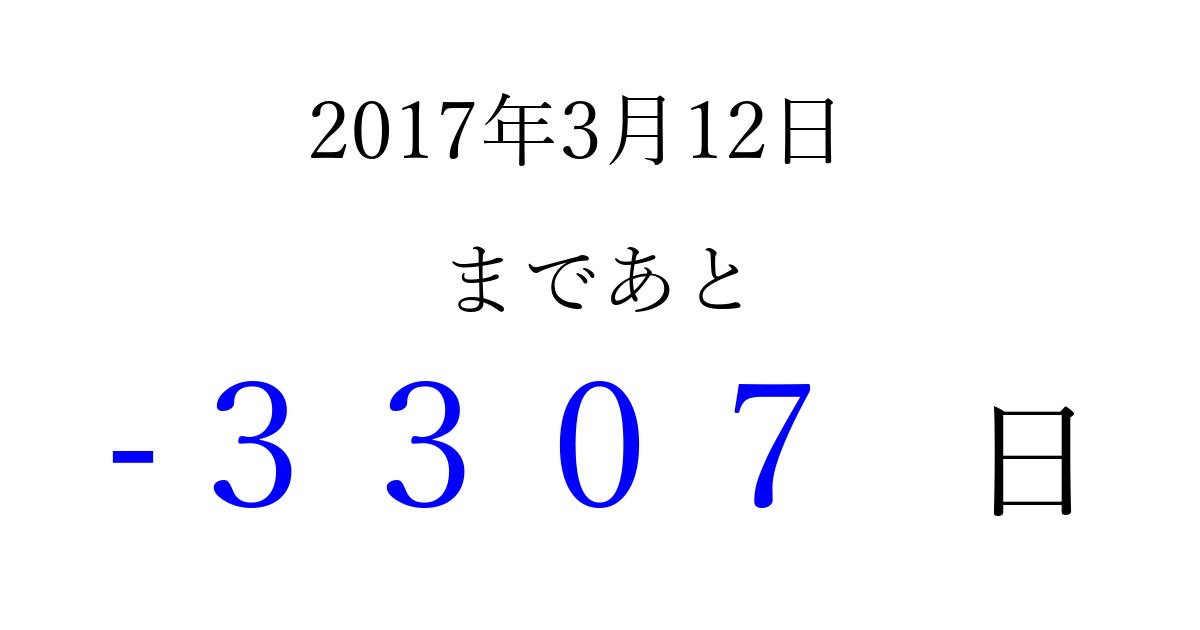 2017年3月12日(日)は もう 0000 日過ぎました 追加すると、トップページからすぐ選べるようになります ※2026/04/01現在の結果です。 最新の状態に更新する ↓シェアして、タイムライン上にカウントダウンを表示しよう!↓ 📤 この結果を共有する Tweet シェア Threads Bluesky 別の日付でカウントダウン 2017年3月のカレンダー このページをブックマークに追加すると、いつでもカウントダウンを確認できます。 (PC: Ctrl+D / Mac: ⌘+D) hitome-notes.comでは以下のページも運営しています。 指定日と期間から日付を計算 | ガチャ確率計算・シミュレーション | プライバシー・ポリシー 運営者:Avocado