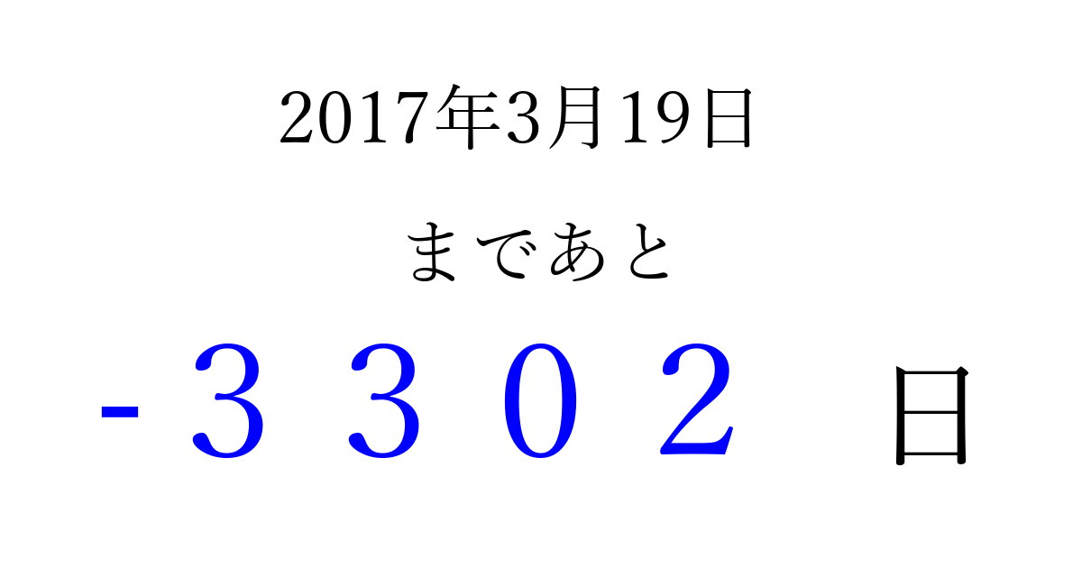 2017年3月19日(日)は もう 0000 日過ぎました 追加すると、トップページからすぐ選べるようになります ※2026/04/03現在の結果です。 最新の状態に更新する ↓シェアして、タイムライン上にカウントダウンを表示しよう!↓ 📤 この結果を共有する Tweet シェア Threads Bluesky 別の日付でカウントダウン 2017年3月のカレンダー このページをブックマークに追加すると、いつでもカウントダウンを確認できます。 (PC: Ctrl+D / Mac: ⌘+D) hitome-notes.comでは以下のページも運営しています。 指定日と期間から日付を計算 | ガチャ確率計算・シミュレーション | プライバシー・ポリシー 運営者:Avocado