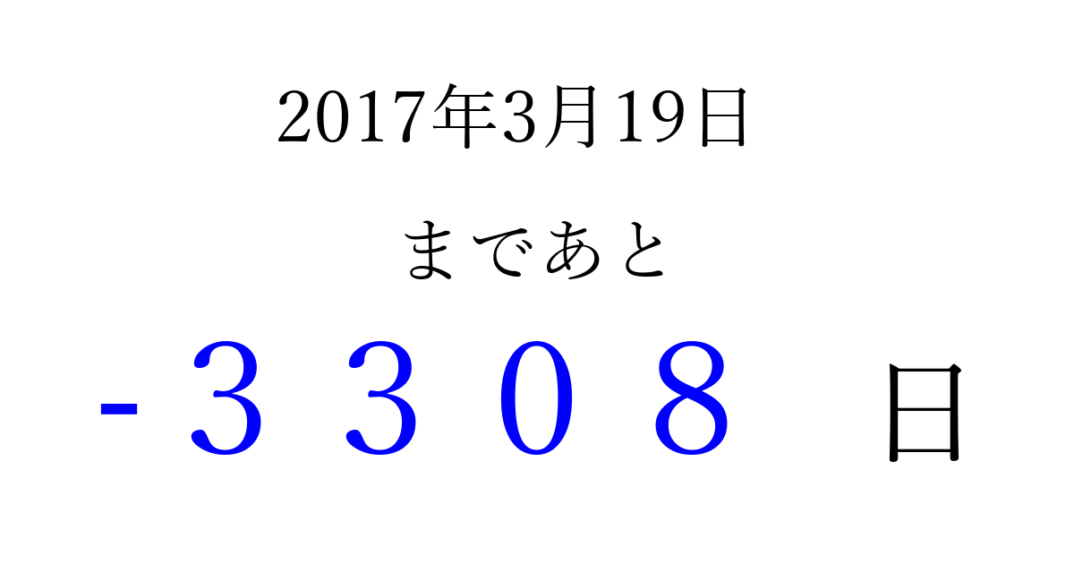 2017年3月19日(日)は もう 0000 日過ぎました 追加すると、トップページからすぐ選べるようになります ※2026/04/09現在の結果です。 最新の状態に更新する ↓シェアして、タイムライン上にカウントダウンを表示しよう!↓ 📤 この結果を共有する Tweet シェア Threads Bluesky 別の日付でカウントダウン 2017年3月のカレンダー このページをブックマークに追加すると、いつでもカウントダウンを確認できます。 (PC: Ctrl+D / Mac: ⌘+D) hitome-notes.comでは以下のページも運営しています。 指定日と期間から日付を計算 | ガチャ確率計算・シミュレーション | プライバシー・ポリシー 運営者:Avocado